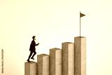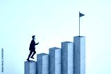 Businessman walking to concrete business chart top with flag on white background. Success, financial growth and strategy concept.