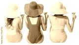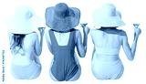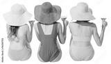 Summer fashion. Back view of three stylish women in hats sitting in retro style swimming suit over transparent background. Concept of beauty, fashion, vintage style, summertime, drink beach and pool