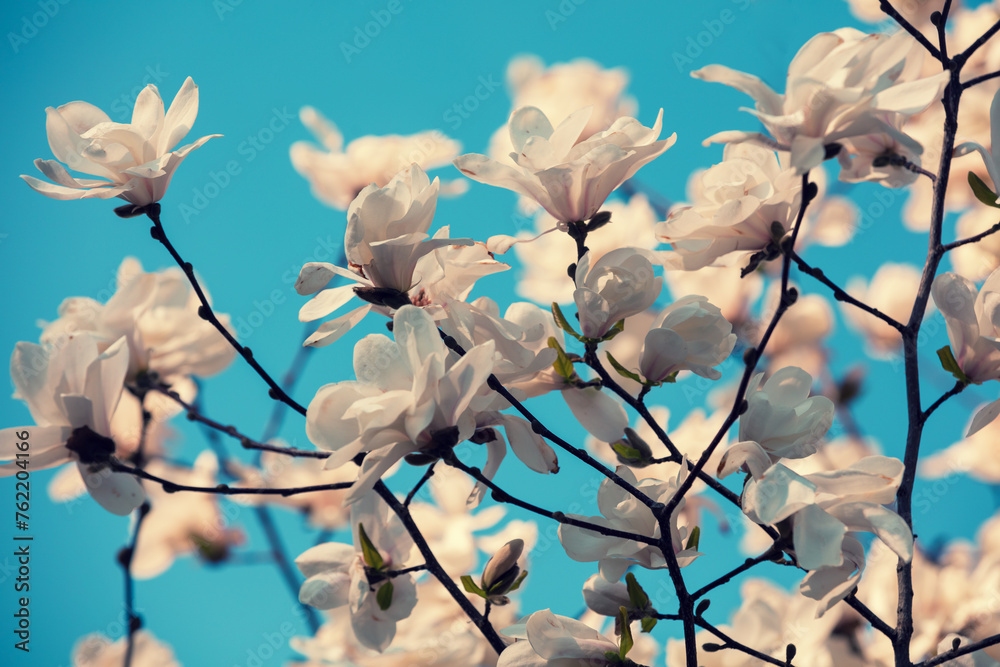 Blooming white flowers of Magnolia stellata against the blue sky. Spring. Blue vintage floral background