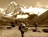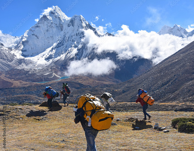 The adult sherpa porters carrying heavy backpacks and sacks in the Himalayas at Nepal, in the background the mountain of Ama Dablam