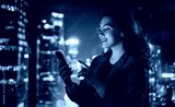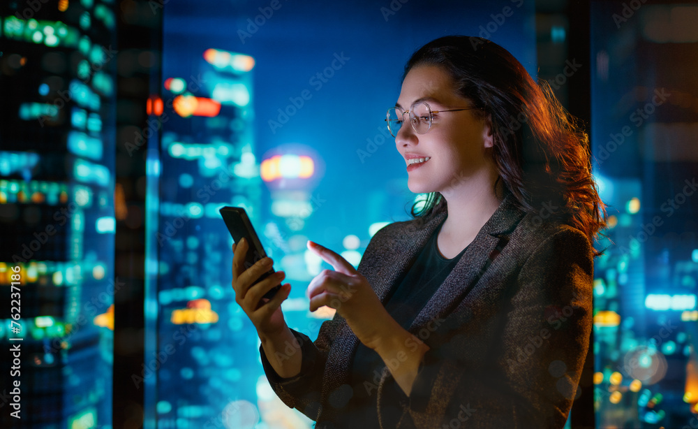 businesswoman using phone near window
