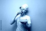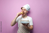 guy housewife in an apron and a hat eats a croissant on a pink background, a chef in uniform tastes pastries