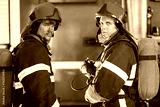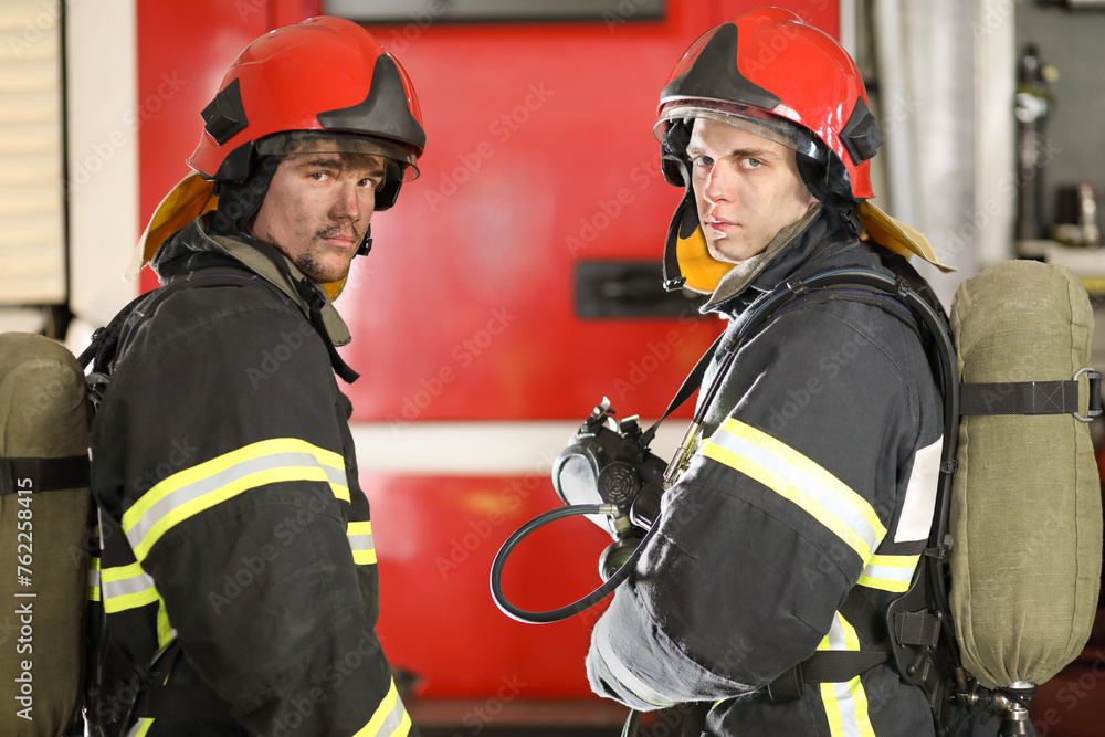 Two firefighters in protective suits and red fire helmet and oxygen bottles standing against fire engine, view from back, look around