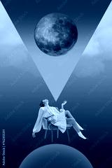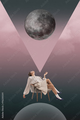 Elegant woman in white dress sitting on chair under large moon against multicolored background with abstract geometric shapes. Contemporary art collage. Concept of surrealism, creative vision. Poster