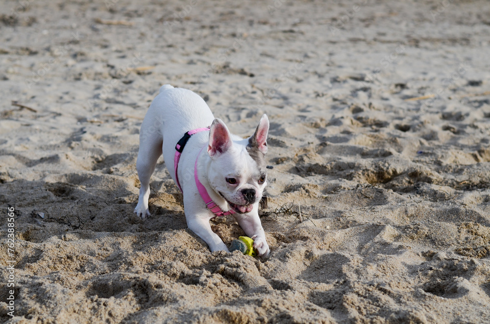 French bulldog is playing on the beach by the sea. The pet loves sand. Purebred dog running.