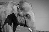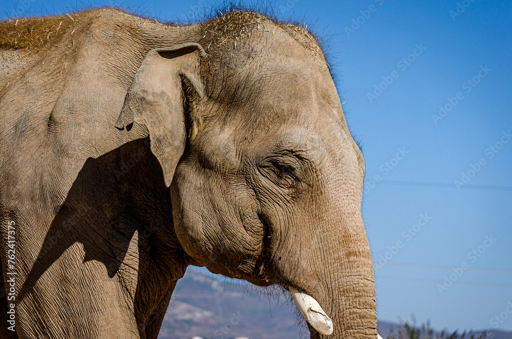 Close up View of an Asian Elephant Head with Tusks. Blue Sky in Background. Portrait of the Big Mammal Animal.