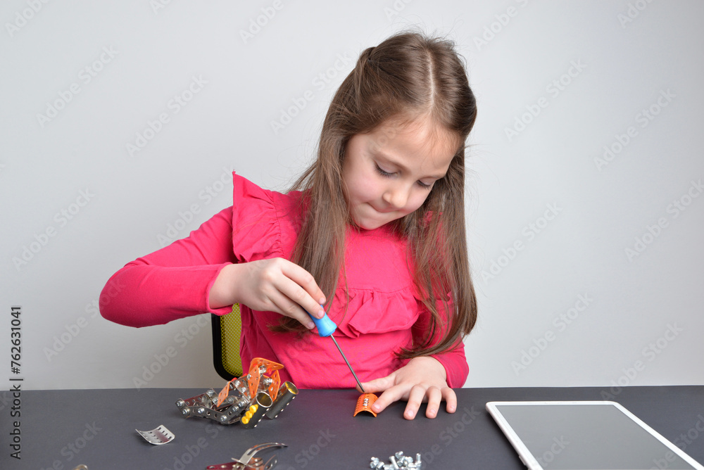Little girl screws metal parts onto a robot. Concept of hands-on learning, education, creativity, and engineering exploration