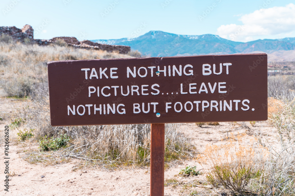 Take nothing but pictures leave nothing but footprints motto on a sign