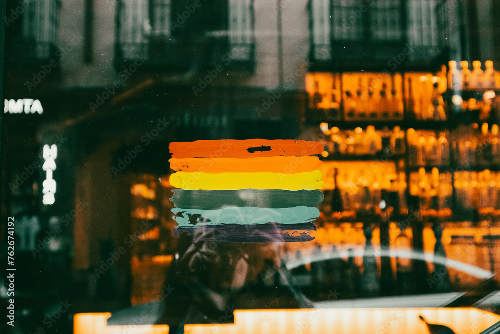 Rainbow flag drawn with different colors on a glass front door of a cafe, restaurant. Gay friendly public place. Pride month celebration symbol.