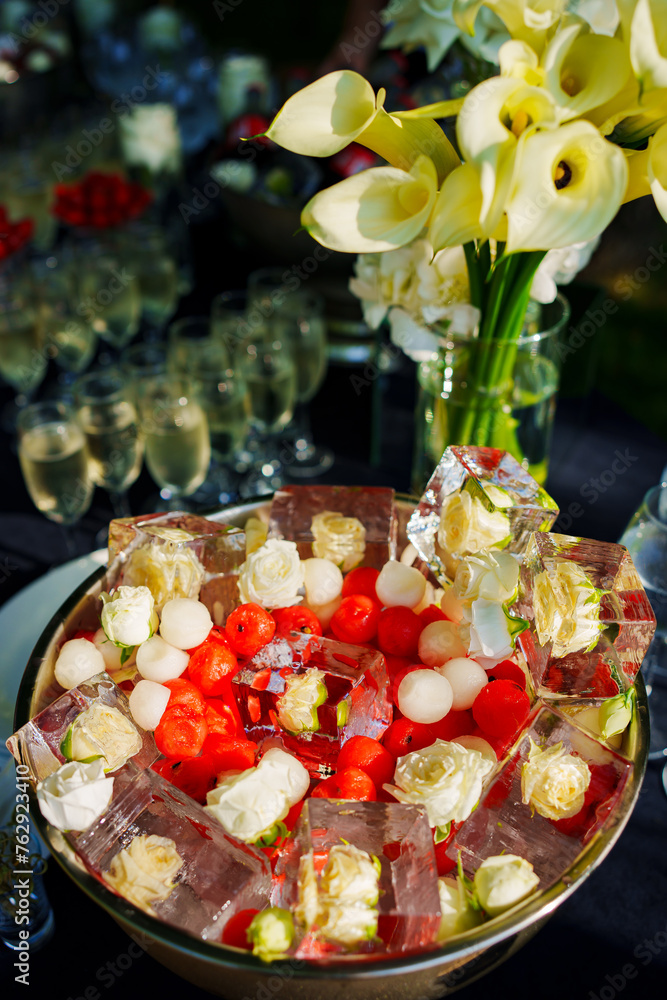 A bowl of ice cubes with frozen flowers and berries.