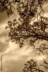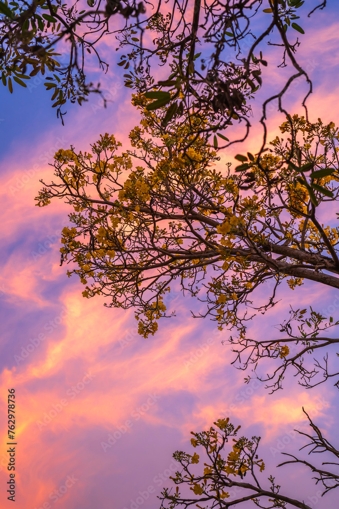 Wooden branches blooming Yellow Golden trumpet tree or Tabebuia are blooming with the park in spring day in the garden and sunset blue sky cloud background in Thailand.