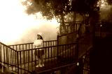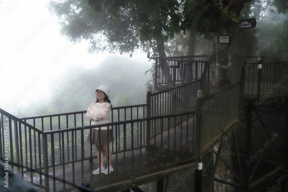 Asian Tourist women On the wooden walkway with Foggy forest Beautiful landscape Scenic view of misty mountain nature background. in Chiang Mai, Thailand