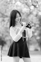 Portrait cute smiles Asian of attractive young teenage girl a holding the camera in blooming Yellow Golden Tabebuia Chrysotricha flowers with the park in spring day at Evening background in Thailand.