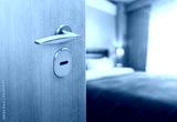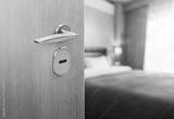 Opened door of hotel room with blurred bedroom background