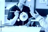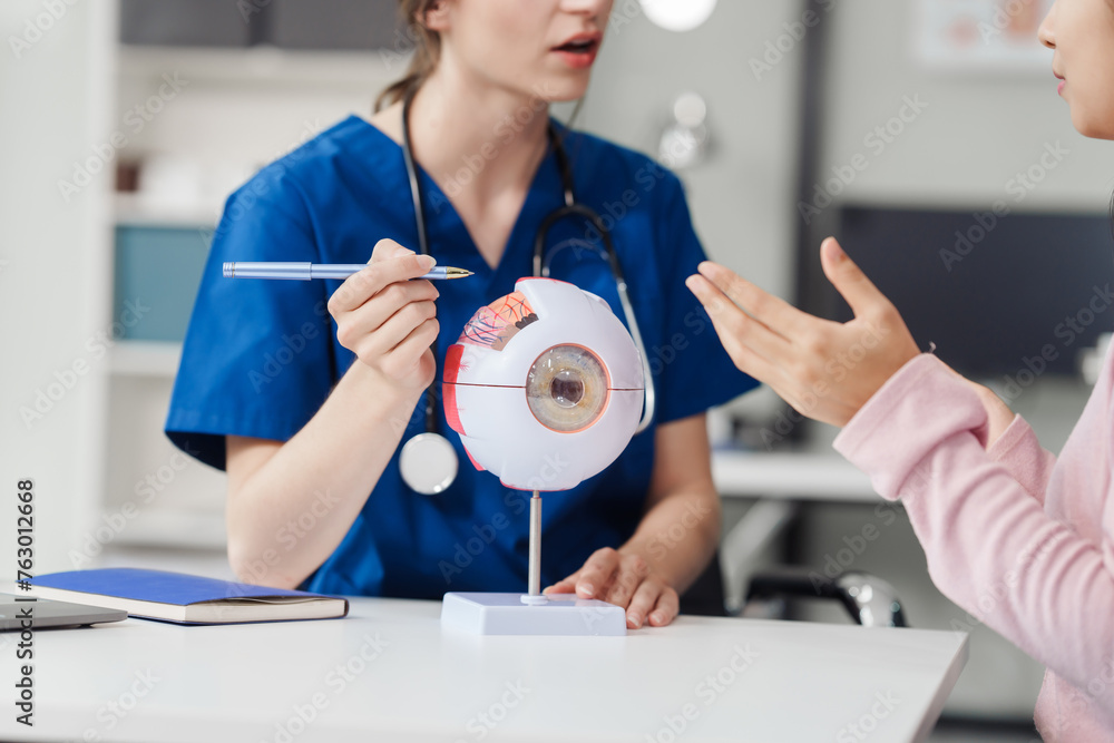 Female Caucasian ophthalmologist explains about eye diseases using the eye model with an Asian female patient At the table in the hospital examination room, Glaucoma, Cataract, Diabetic Retinopathy