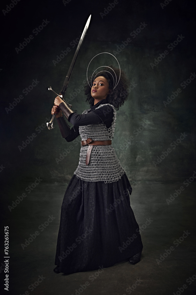 Brave young African woman, medieval warrior in chainmail armor with halo-like rings above head making sword swing against vintage background. Concept of history, beauty and fashion, comparison of eras