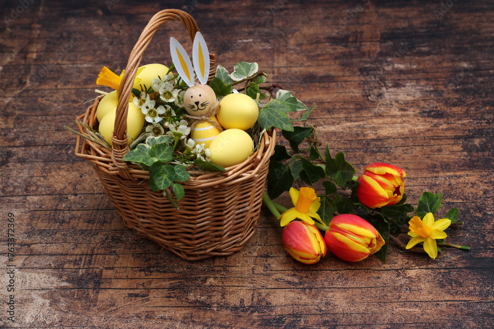 Planted basket with flowers and Easter eggs. Space for text.