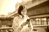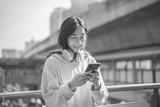 Beautiful young happy asian woman with headphones looking at mobile phone while standing in the city