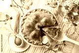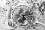 Directly above Easter table, with colored eggs, flowers, Savory Easter pie, Torta Pasqualina, made with spinach, silverbeet, leek, cheese and whole boiled eggs, originated in Italy. Homemade food.