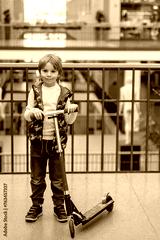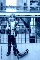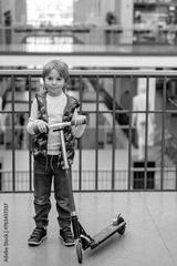 Cute child, school boy in a shopping mall, using escavator, riding or holdin push scooter