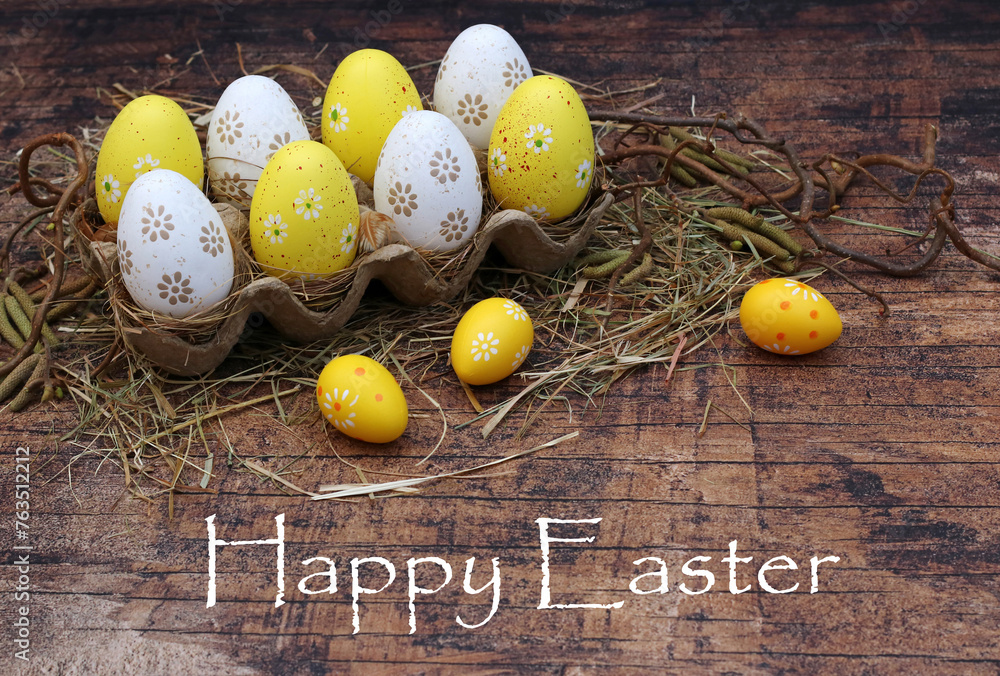 Greeting card Happy Easter: Easter eggs in an egg box with the Easter greeting Happy Easter.