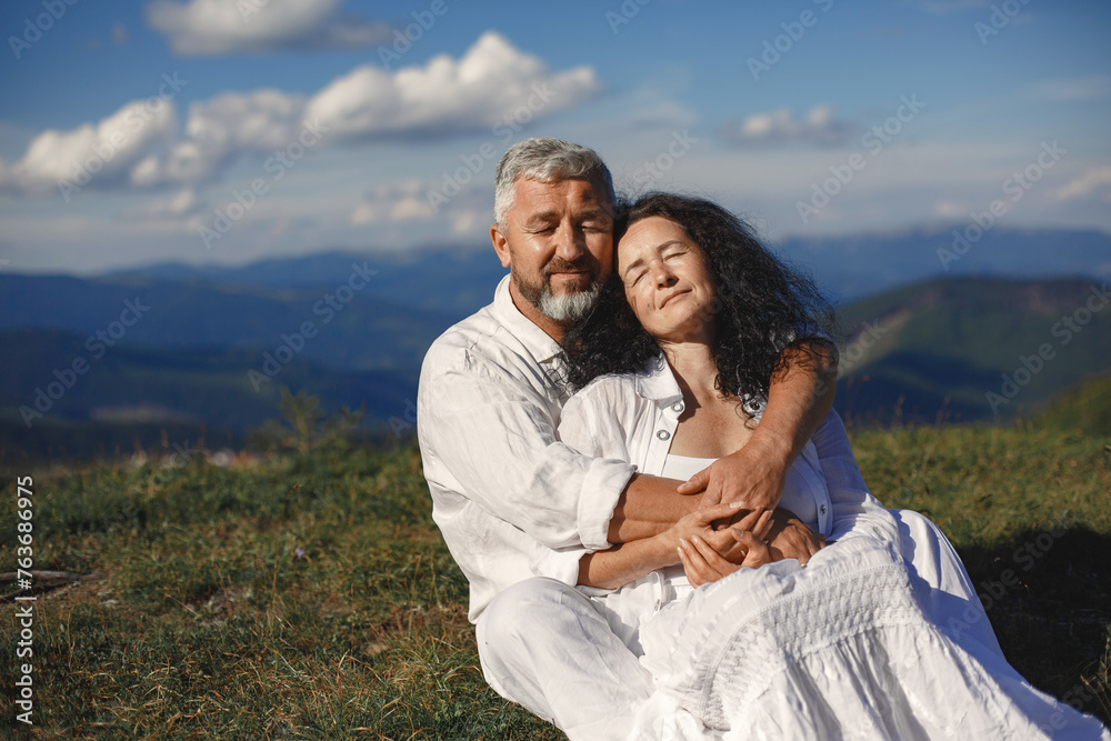 Adult couple walk in the mountains