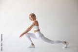 Beautiful blonde girl posing on a white background in white leggings and a white top