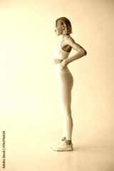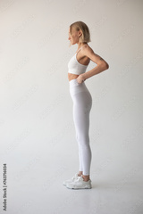 Beautiful blonde girl posing on a white background in white leggings and a white top