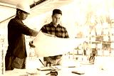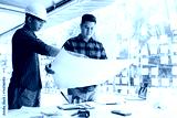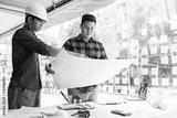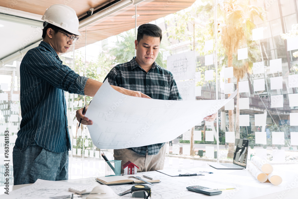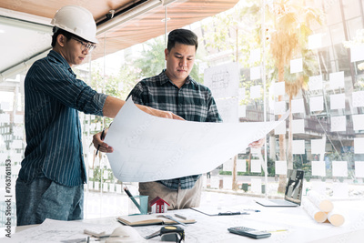 Architects or engineering working with blueprints and discussing project together at the meeting in the office.
