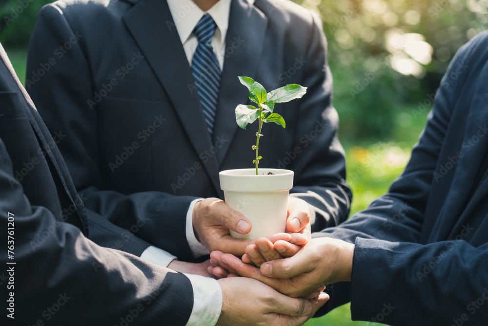 Earth Day Environmental, Business hands holding a plant pot with green plants in the ground together symbolizes green business company and green business cooperation.