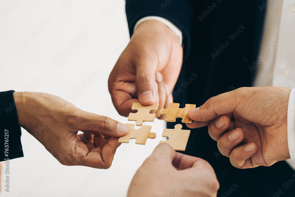 The concept of teamwork and partnership. Businessman's hands putting together puzzle pieces in the office and join together in a jigsaw puzzle team. Charity. Volunteers. Business unity as a team.
