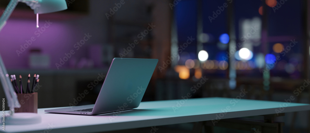 A laptop computer on a table in a modern dark office room at night features dim purple neon lights.