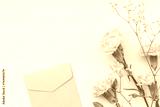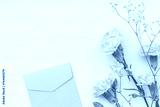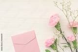 Pretty frame of pink carnations, white hazel and pink envelopes on a white wood table
