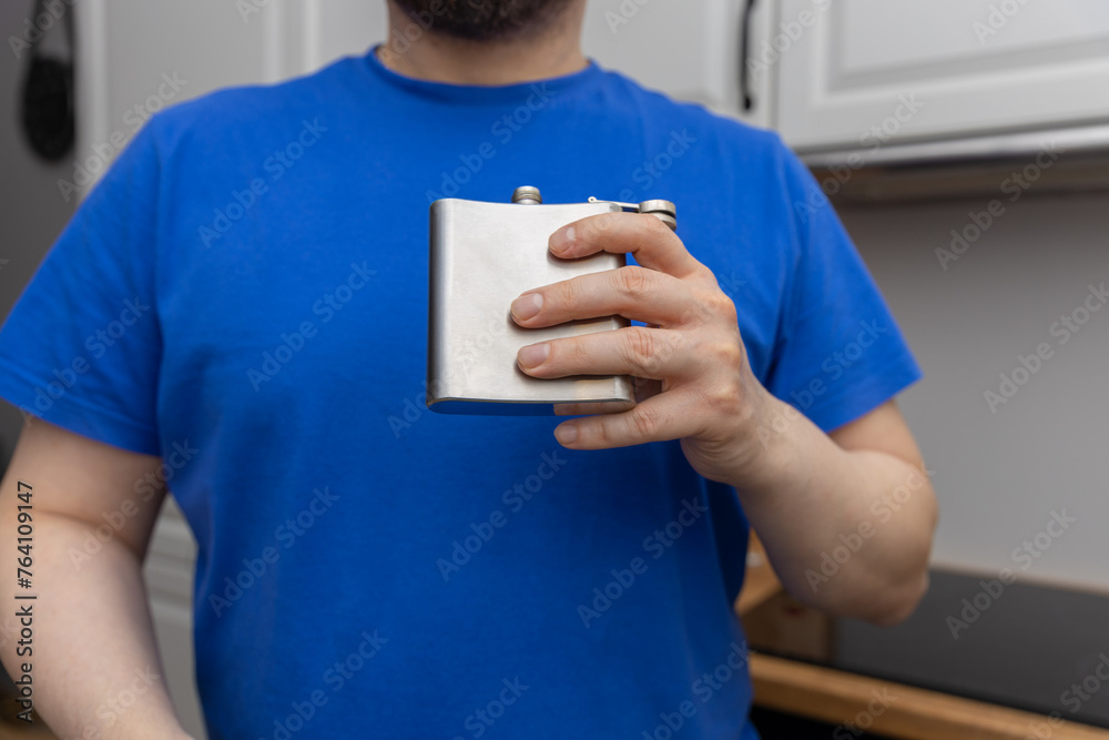 Mężczyzna, trzymający piersiówkę, odzwierciedla problem nadużywania alkoholu w społeczeństwie. Omawia kwestię alkoholizmu oraz promuje ideę zdrowego stylu życia i podejścia do picia