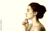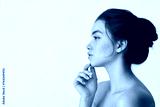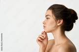 Beauty aesthetic profile side face portrait of young adult Latin woman, pretty brunette Hispanic girl model with freckles on face looking at copy space isolated on white background. Skin care ads.