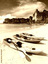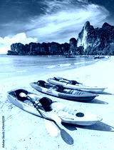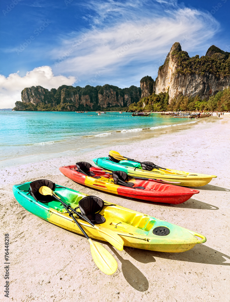 Kayaks on tropical beach, active holidays concept.