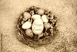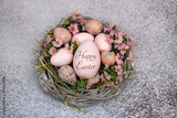 Greeting card Happy Easter: Easter basket with a labeled Easter egg.