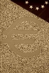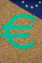 Euro symbol. Wheat. Grain. European Union flag. European Green Deal. Top view.
