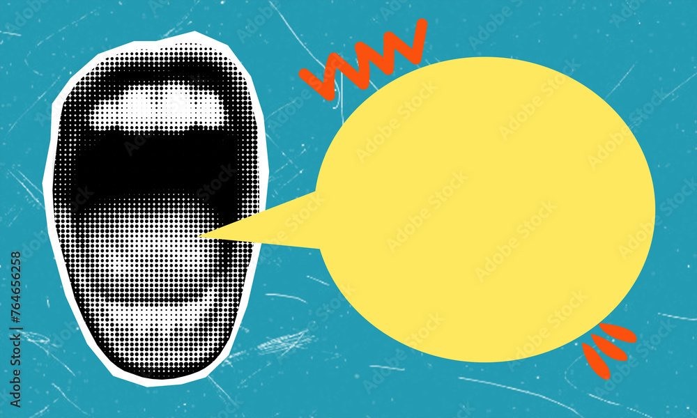 Artistic collage with a screaming mouth on a blue background and a yellow message.