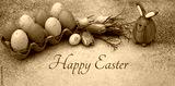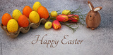 Greeting card Happy Easter: Easter eggs, flowers and Easter bunny with the inscription Happy Easter.