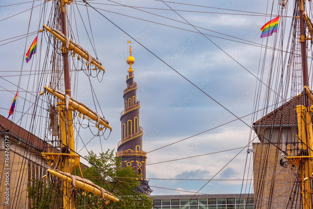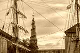Church of Our Saviour, old houses and ships in Old Town of Copenhagen, Denmark.