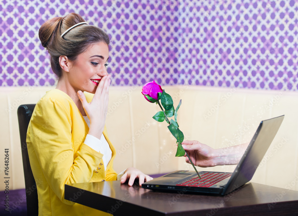 Man offering a rose to a beautiful woman over laptop screen