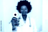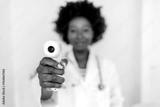 Portrait, woman and doctor with infrared thermometer to check temperature, test fever and safety in hospital. Happy young healthcare professional with laser, scanner and medical consulting for virus.
