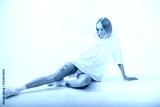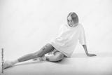 Beautiful girl in a white oversized t-shirt posing on a white background. Posing sitting on the floor.