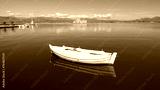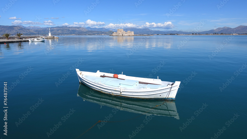 Beautiful small castle of Bourtzi built at sea a popular attraction in city of Nafplio former capital of Greece as seen at spring morning with nice white clouds and deep blue sky, Argolida, Greece