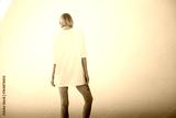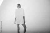 Beautiful girl in a white oversized t-shirt posing on a white background. Posing with his back.