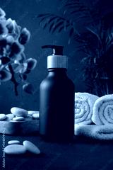 Matte black bottle with a wooden pump cap surrounded by natural elements including a vibrant purple orchid, white stones, and green moss
