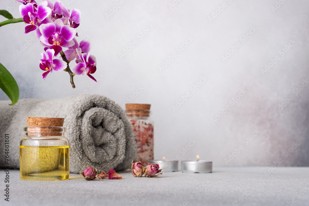 A serene spa still life featuring essential oils, a rolled grey towel, rose bath salt and a vibrant purple orchid.