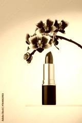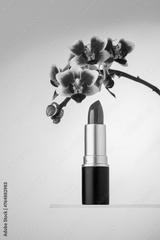 An elegant image showcasing a vibrant pink lipstick beside a beautiful purple orchid flower
