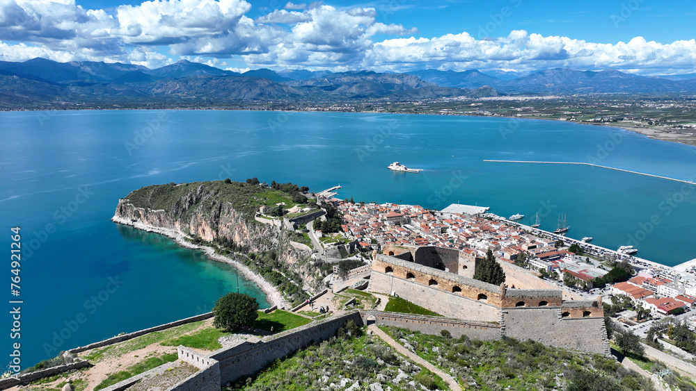 Aerial drone photo of iconic Acronafplia fortress overlooking old city of Nafplio below famous castle of Palamidi as seen in a spring morning with beautiful clouds and deep blue sky, Argolida, Greece
